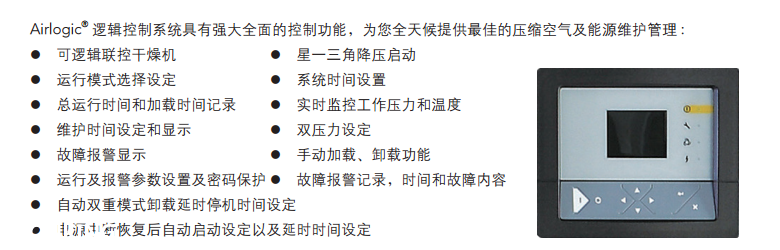Airlogic®邏輯控制系統(tǒng) 昆西QGD/QGV系列標配Airlogic®邏輯控制系統(tǒng)。無論在干燥或潮濕、炎熱或寒冷的環(huán)境中,是您可信賴的無故障運行的控制平臺。中文真彩色液晶,界面友好,操作簡便。 提供多種控制模式的選擇,提高供氣質(zhì)量,運行可靠,效率更高?蓪嚎s機設定為本地控制模式、遠程控制模式和網(wǎng)絡控制模式。本地控制模式下,壓縮機加載,如果壓力持續(xù)上升到卸載壓力,壓縮機進入卸載狀態(tài)。在卸載狀態(tài),如果設定的時間內(nèi)沒有負荷需求,壓縮機會進入待機狀態(tài),以節(jié)省能源。直到有新的負荷需求,壓縮機再次啟動進入加載狀態(tài)。在遠程控制模式下,設備切換到遠程進行啟停。在網(wǎng)絡模式下,可實現(xiàn)多臺QGD/QGV壓縮機聯(lián)網(wǎng)運行。每臺壓縮機根據(jù)負荷情況自動進行啟停,加卸載控制,相互配合以實時滿足負荷要求。每臺壓縮機按自身的網(wǎng)絡lD,順序地進入或退出網(wǎng)絡,退出即進入停機狀態(tài)。 Airlogic®邏輯控制系統(tǒng)具有強大全面的控制功能,為您全天候提供優(yōu)秀的壓縮空氣及能源維護管理: