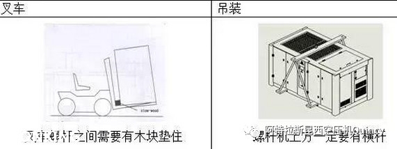 螺桿空壓機(jī)在安裝前需要放置在指定位置,在運(yùn)輸放置過程中可以使用叉車或者吊裝的方式進(jìn)行運(yùn)輸放置,但是需要注意操作方式需按下圖展示要求進(jìn)行。