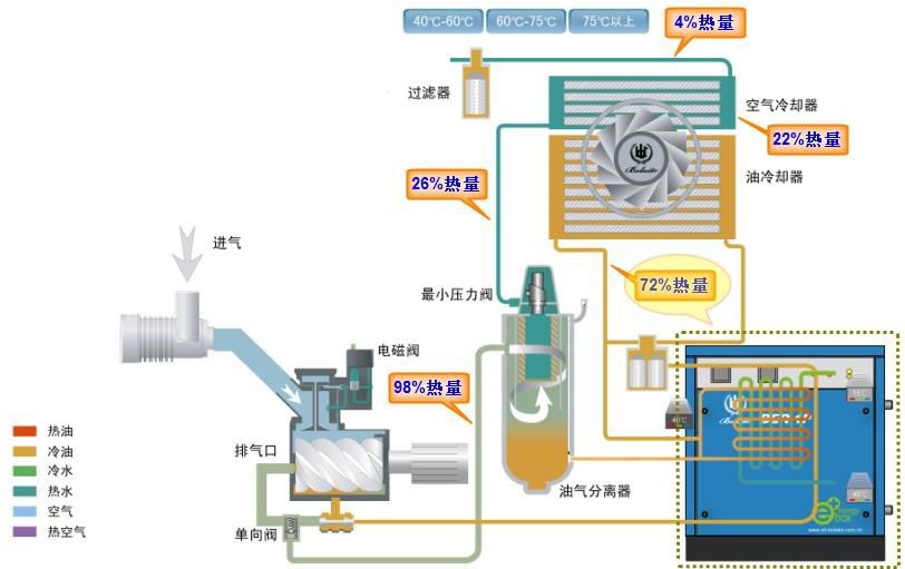對于噴油螺桿壓縮機,大約 90% 的能耗轉(zhuǎn)換成壓縮熱后流失,熱能回收系統(tǒng)能夠保證在對壓縮機性能不產(chǎn)生任何影響的前提下,以熱水或溫水的形式回收大約70% 的能量,可為用戶節(jié)約大量能源。